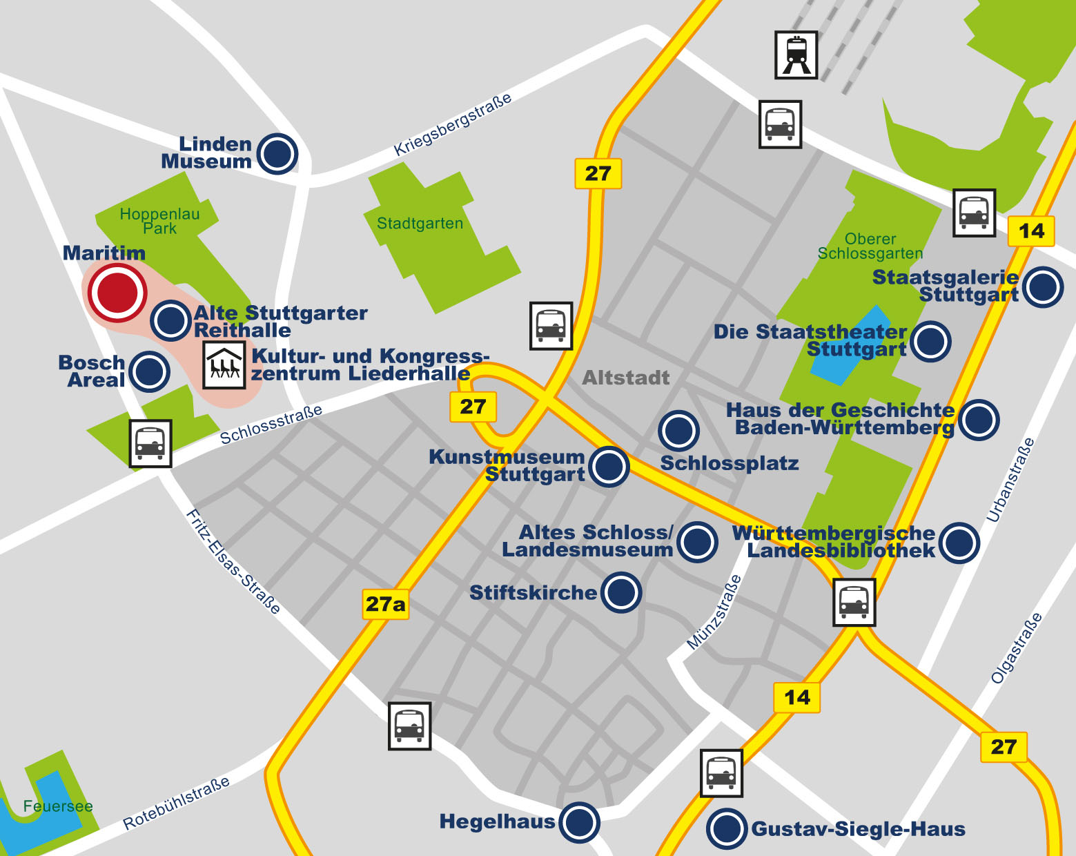 From main station: | Tramway U9 in direction to "Vogelsang" to stop "Berliner Platz" (Liederhalle) or tramway U1 in direction to "Heslach Vogelrain" to stop "Berliner Platz" (Liederhalle) |