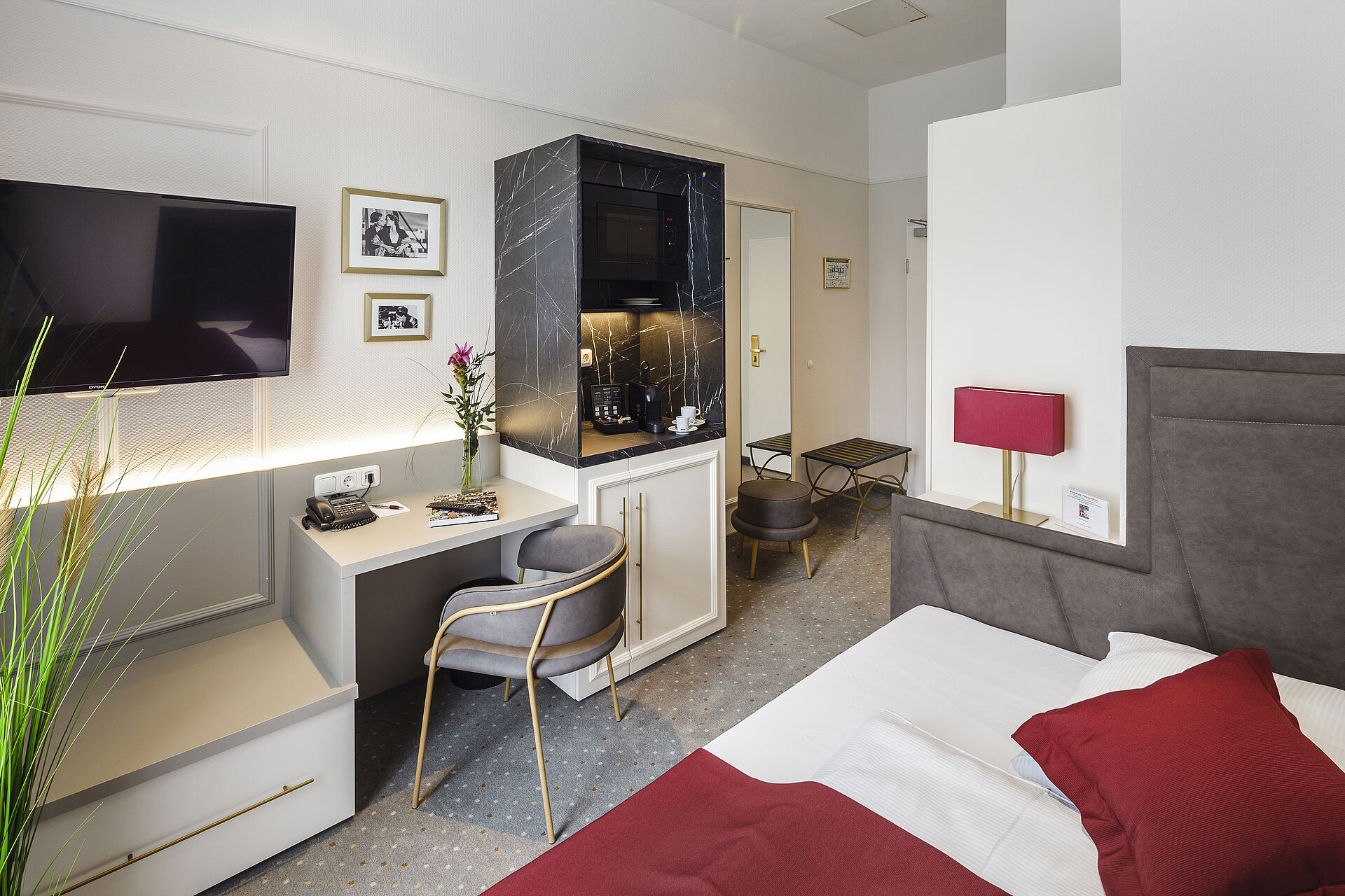 Good to know: All rooms and suites at the hotel have a microwave, a minibar and free Wi-Fi. The minibar is included in the price of every room. If you book directly (not via third-party websites), it will be refilled for you as a guest at the Hotel Wiesbaden every day free of charge. So just stay right here and book your overnight stay in Wiesbaden at the best price!