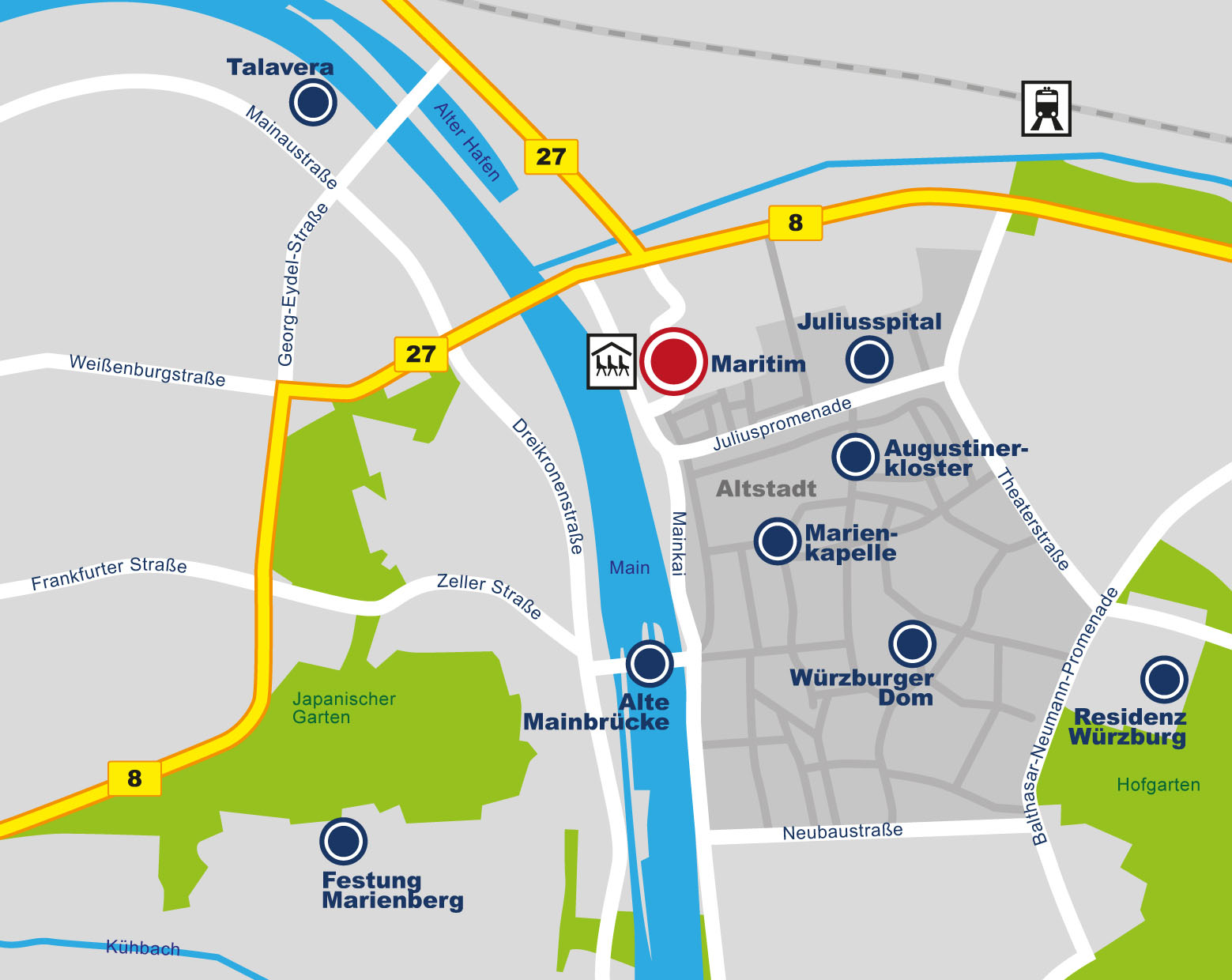 The Maritim Hotel Würzburg is directly connected to the Würzburg Congress Centre and is located centrally on the banks of the Main river, not far from the railway station. The hotel is an ideal starting point for a walk through the baroque old city, a visit to the quaint wine cellars and the market place with its wine festivals and the traditional Christmas market in December.