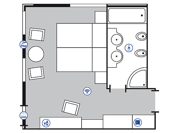 In addition to fantastic views, we of course have even more up our sleeve, which you can read about in the detailed room descriptions below. The portfolio also includes rooms with connecting doors for those arriving as a couple but wishing to sleep alone. These are located on the spa garden side on floors 2, 4, 6 and 8 and on the seaview side on floors 3, 5, 7 and 9.