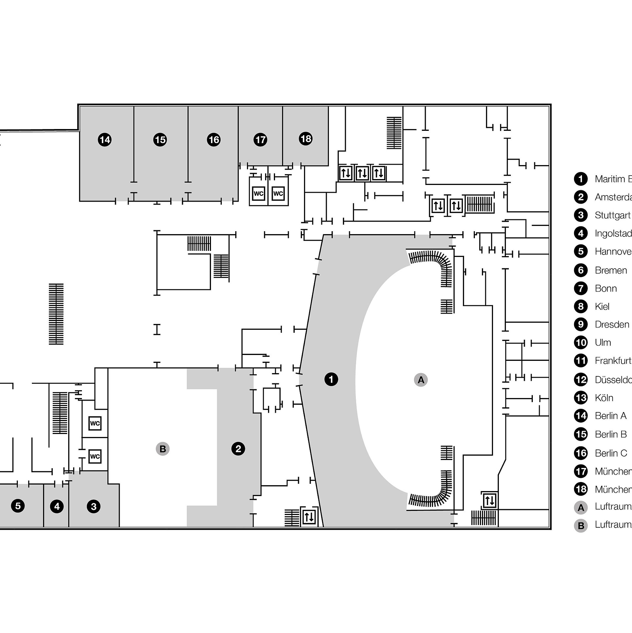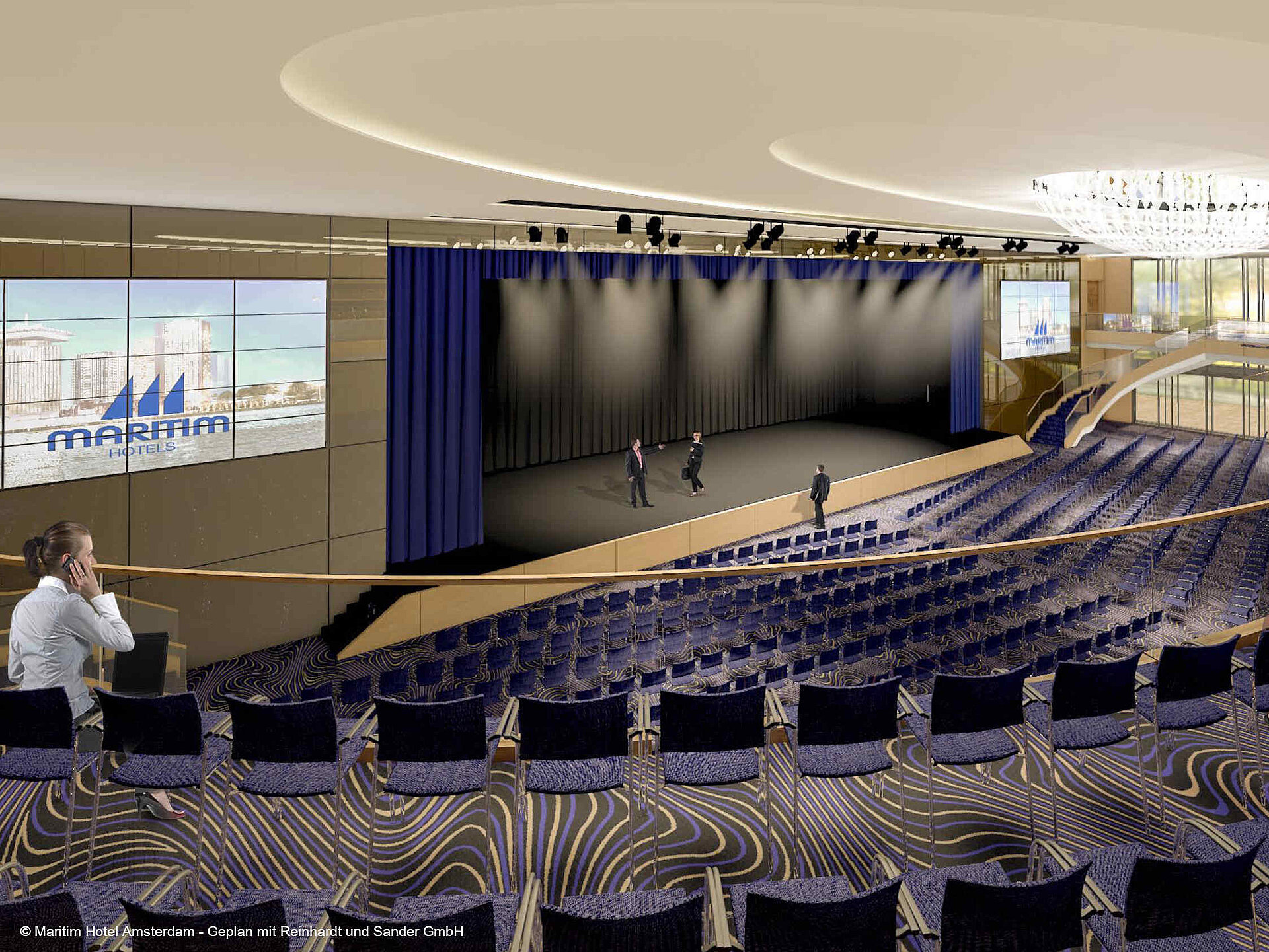 The impressive "Maritim" hall is the largest event space within the Maritim Hotel Amsterdam, offering over 1,700 sqm of versatile space for various event formats. Depending on the seating arrangement, the hall can accommodate up to 2,200 guests. Whether it is a conference, exhibition, incentive event, concert, party convention, roadshow, kick-off, or large corporate celebration, the Maritim hall stands out for its versatility and is particularly well-suited for large-scale events. The room, like all other event spaces in the hotel, is bathed in natural light, creating a bright and inviting atmosphere.