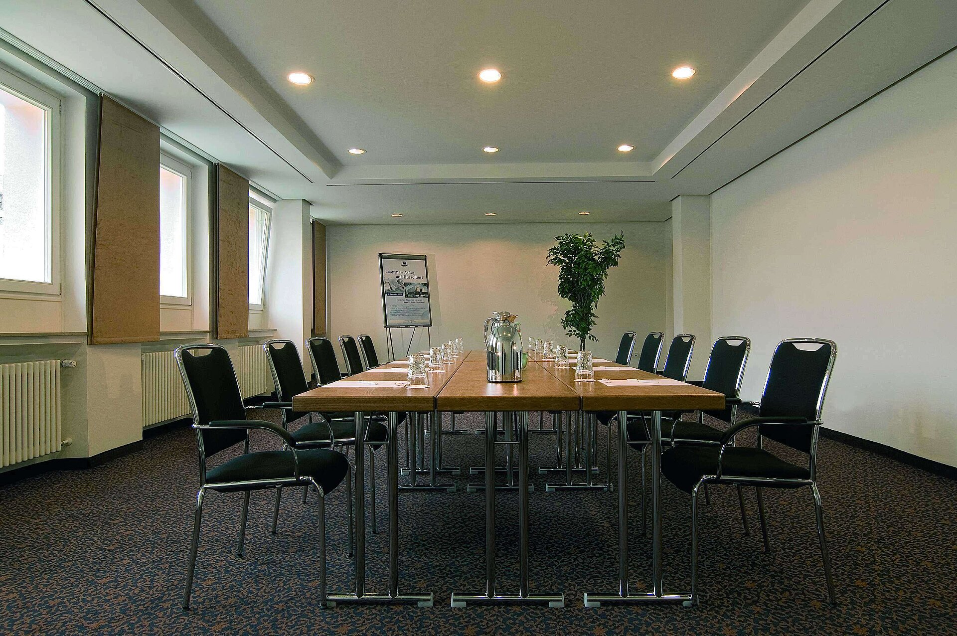 Projectors, 2.5 x 3.5 m electromotive screens, acoustics via mobile loudspeakers. A CAT 7 integration between the conference rooms is available. Each conference room is equipped with phone, fax, ISDN and Internet ports (with up to 16 Mbit/s).