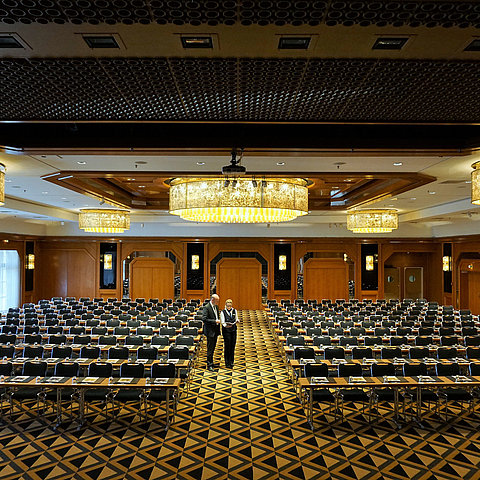 The "Saal Maritim" (Maritim Hall) can accommodate 560 people and offers flexible room arrangement options that allow you to personalise your event. The large built-in stage with PA system that is adapted for the event, sound mixing desk, built-in projection screens and light mixing desk are just some of the highlights that this function room has to offer. Exhibitions, theatrical performances, concerts, sporting activities and roadshows – all are possible in this space.