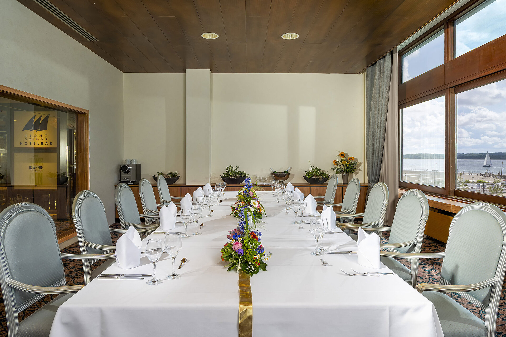 The modern event room "Saal Schleswig-Holstein" (Schleswig-Holstein Hall) with a view of the sea creates the ideal setting for your individual event. Whether conferences, seminars, exhibitions, private parties, large evening events, incentives or product presentations, the state-of-the-art technical equipment in this room caters perfectly to all your communication and information needs. The capacity of the room can be particularly well utilised with long tables, and a fixed dance floor literally brings "swing" into your evening event. The hall is directly connected to the Maritim hall and the restaurant and separated from them by mobile walls. Apart from the atmosphere, the details in organisation and coordination also matter. With our flexibility and experience, we make sure that your needs and wants are met, and your event is a complete success.